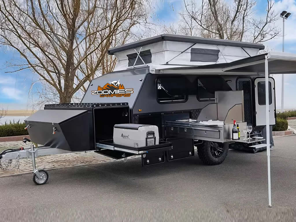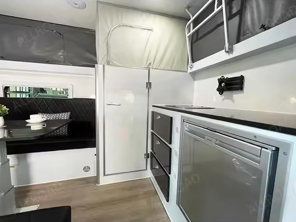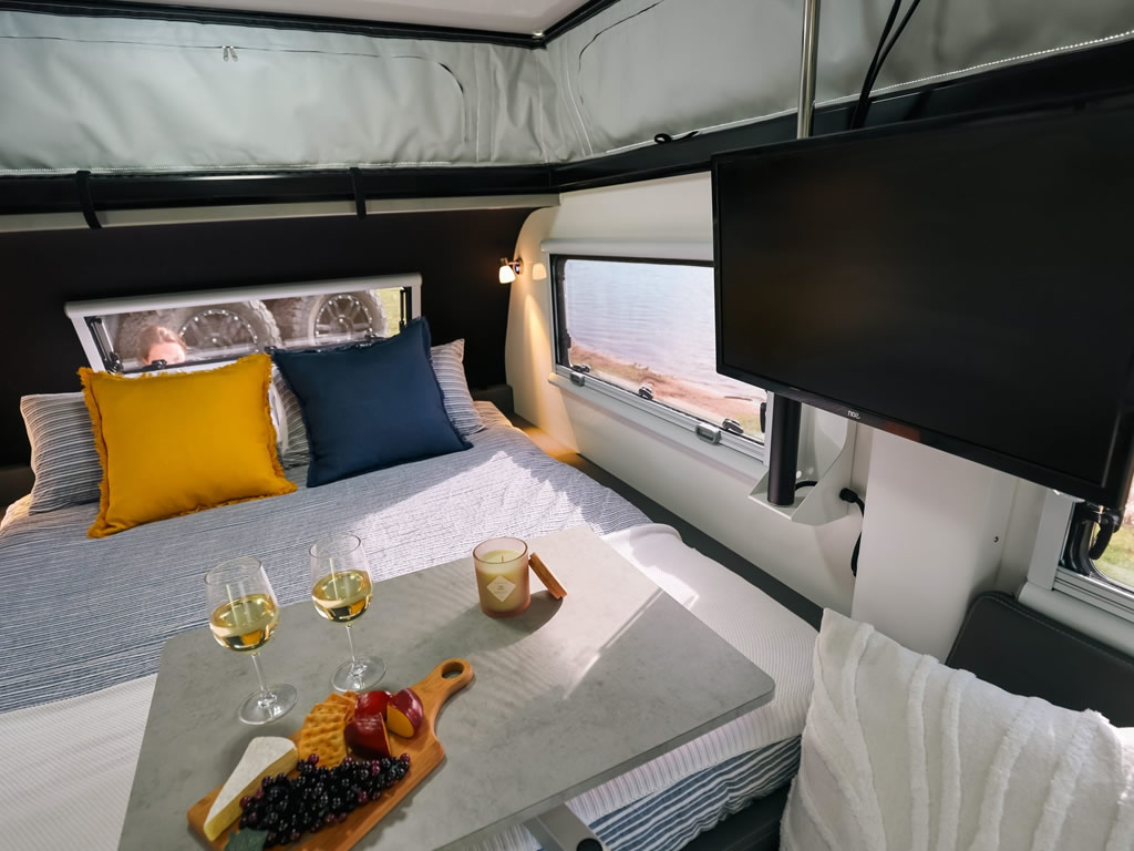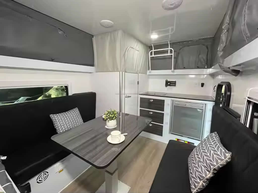Our off-road hybrid pop-top camper is fully equipped for a unique outdoor living experience. The built-in queen bed, equipped with high-quality mattresses and a warm tent, allows you to enjoy a five-star sleep in the embrace of nature.