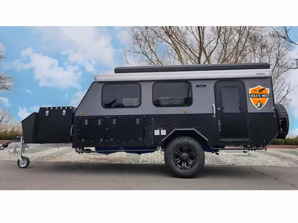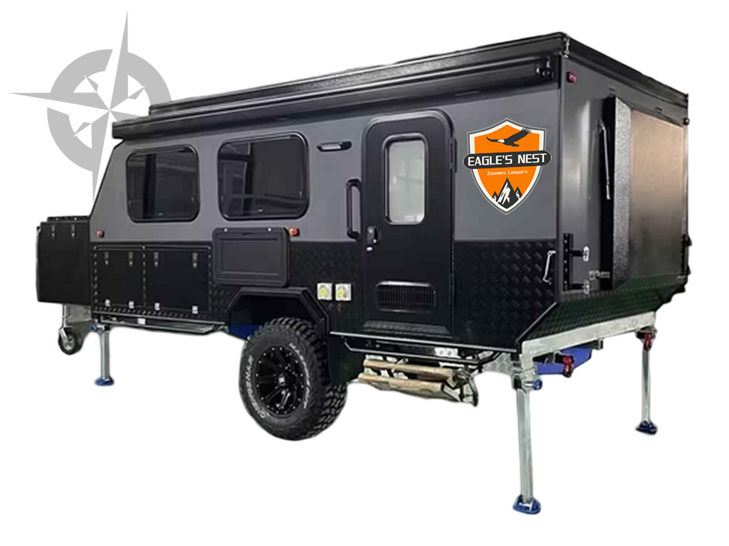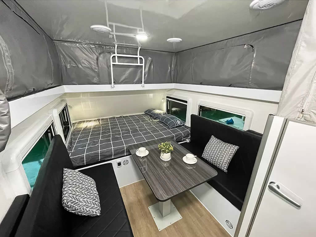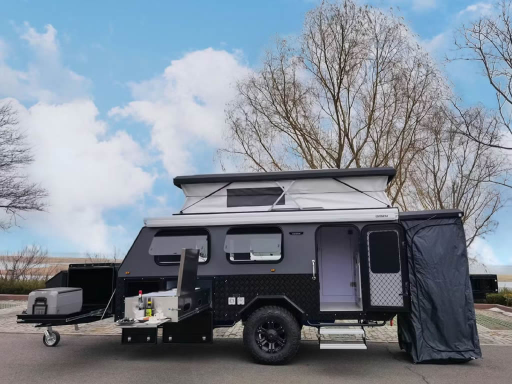Our off-road hybrid pop-top camper is fully equipped for a unique outdoor living experience. The built-in queen bed, equipped with high-quality mattresses and a warm tent, allows you to enjoy a five-star sleep in the embrace of nature.